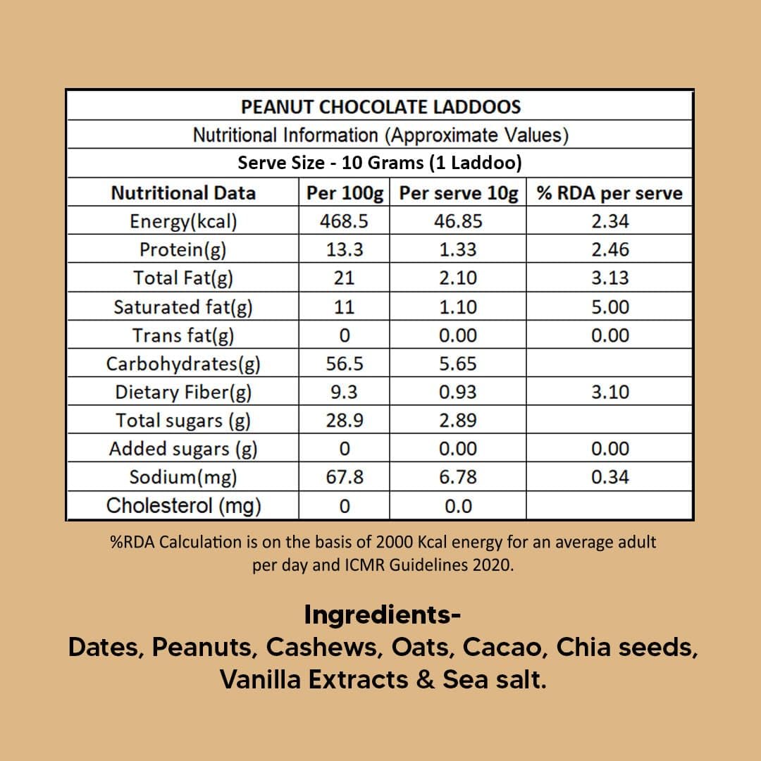 The laddoos are made using just – Dates, Peanuts, Cashews, Cacao, Chia Seeds, Vanilla Extract and Sea Salt. 95% of the laddoos are made with dry-fruits and nuts. 5% is vanilla extract and cacao.