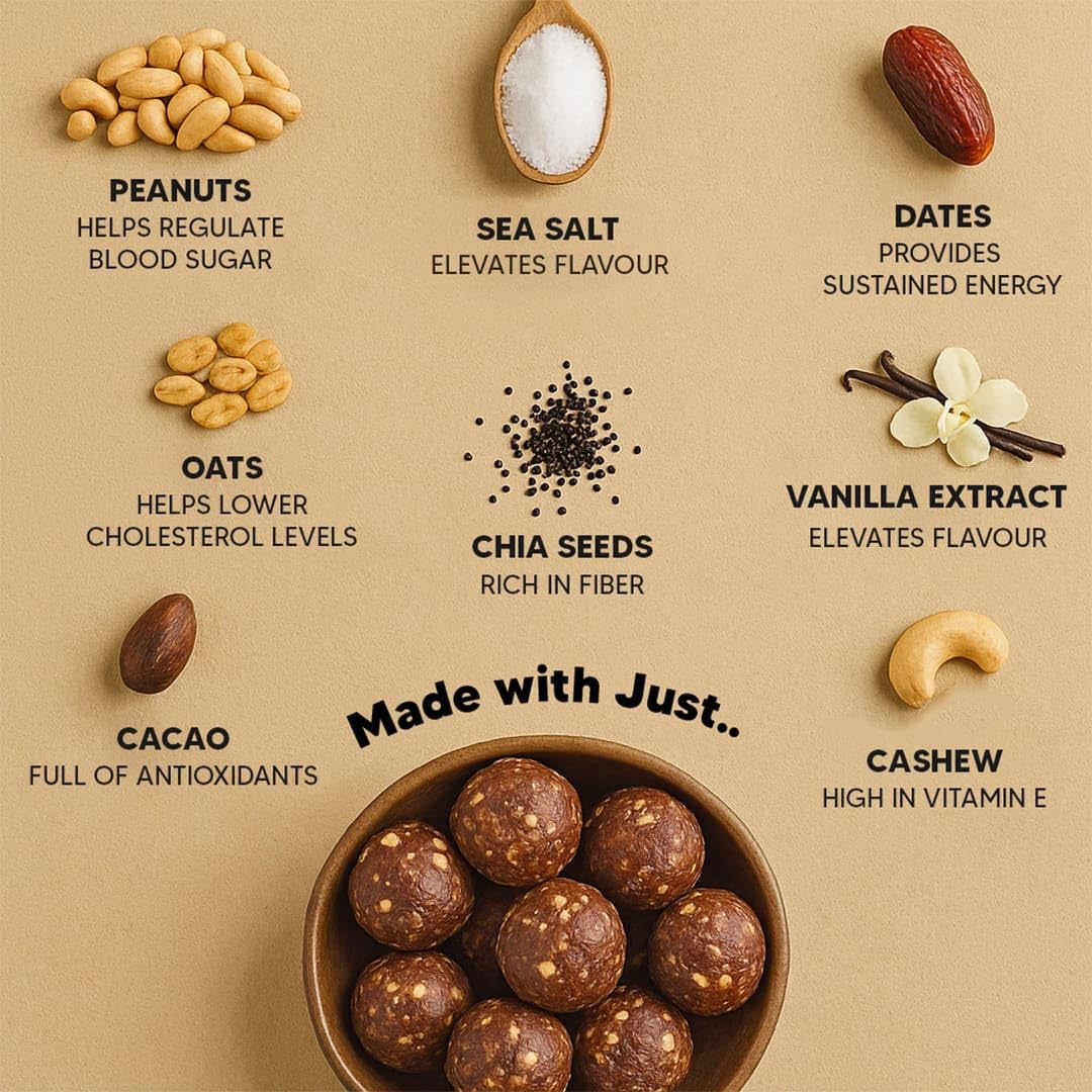 A delightful treat made with Dates, Peanuts, Cashews, Cacao, Chia Seeds, Vanilla Extract and Sea Salt.